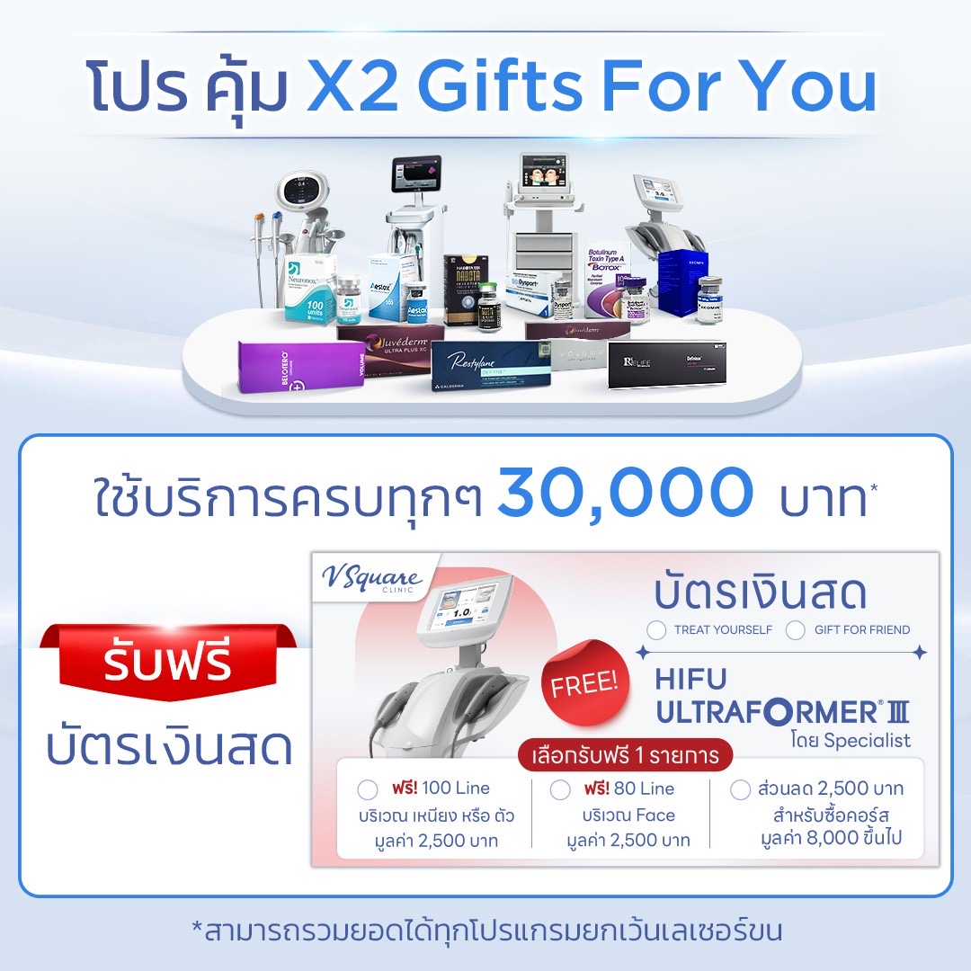 V Square Clinic 1 ใน 6 คลินิกจากประเทศไทย ที่ได้รับรางวัลคลินิกปรับรูปหน้ายอดเยี่ยมที่สุดในเอเชีย ให้บริการปรับรูปหน้า คืนความอ่อนเยาว์ แบบไม่ต้องผ่าตัด โดยใช้ฟิลเลอร์, โบท็อกซ์, เมโสแฟต และเครื่องยกกระชับ ก่อนฉีดแพทย์จะมีการประเมิน วิเคราะห์ปัญหา วางแผนแนวทางแก้ไข และดีไซน์การปรับรูปหน้าเฉพาะบุคคล